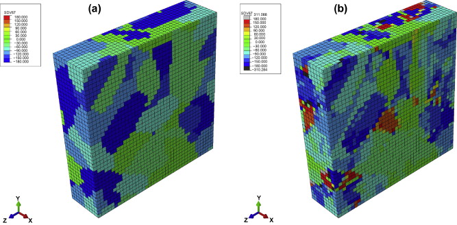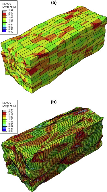 - A crystal plasticity constitutive model, aimed at predicting the elasto-plastic behaviour at the crystal level. The model incorporates physically-based and phenomenological implementations and both slip and twinning mechanisms are considered. Both monotonic response and cyclic behaviour are considered by the combination of different laws for isotropic hardening, kinematic hardening and cyclic softening. The model has already been successfully applied to simulate the mechanical performance of FCC (Al and Ni-based superalloys) and HCP alloys (Mg and Ti), including stress-strain curves and texture evolution under monotonic loading as well as crack initiation and fatigue life under cyclic loading. The model is programmed as a UMAT subroutine for Abaqus.