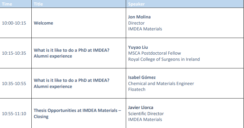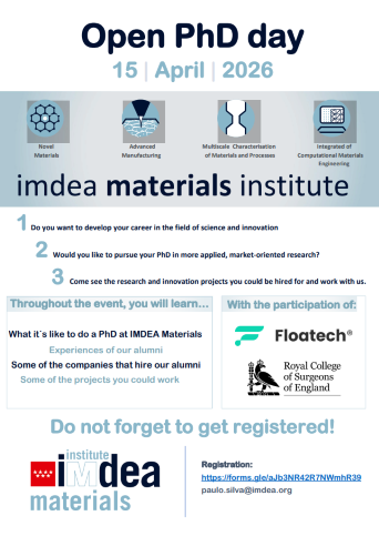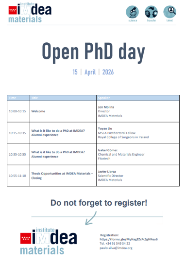 IMDEA Materials no solo es un centro de investigación líder en España, sino en toda Europa. Únete a nosotros el 15 de abril para escuchar de primera mano a investigadores tanto de la industria como del ámbito académico sobre sus experiencias en nuestro instituto, así como las oportunidades disponibles para realizar un doctorado con nosotros”,