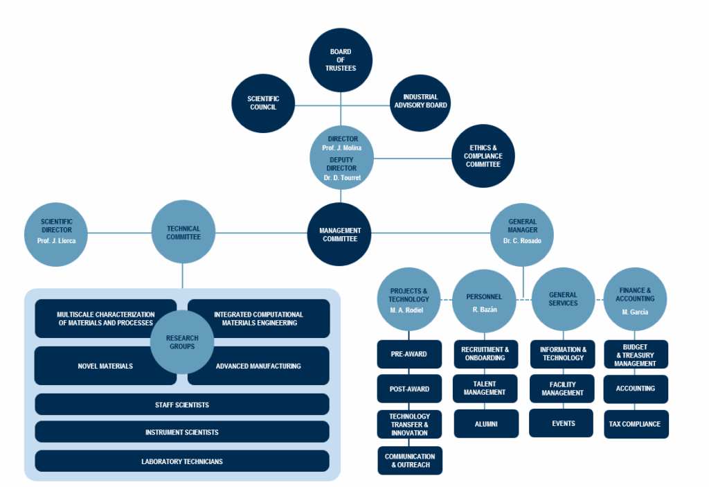 El principal órgano de gobierno del Instituto es el Patronato. Este incluye representantes del gobierno regional de la Comunidad de Madrid (7), patronos permanentes designados por otras instituciones públicas de investigación (2), universidades y centros públicos de la región de Madrid (4),